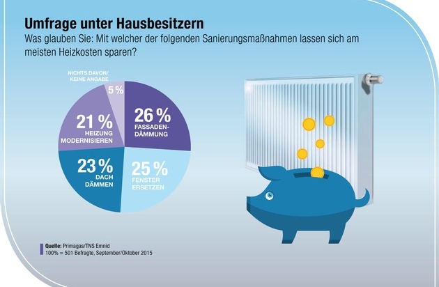 Knapp die Hälfte der deutschen Hausbesitzer geht davon aus, dass sich durch Wärmedämmung die Heizkosten am ehesten reduzieren lassen. Das zeigt eine Umfrage von TNS Emnid im Auftrag des Flüssiggasversorgers Primagas. 26 Prozent halten Fassadendämmung für die effizienteste Sanierungsmaßnahme, um die Energiekosten in den Griff zu bekommen. 23 Prozent erachten eine stärkere Wärmeisolierung des Dachs als besonders sinnvoll. Doch gerade die aufwändige energetische Sanierung der Gebäudehülle ist in jüngster Vergangenheit in die Kritik geraten: Sie sei zu teuer, und die Ersparnis oft geringer als erwartet, lautet der Vorwurf der Experten.