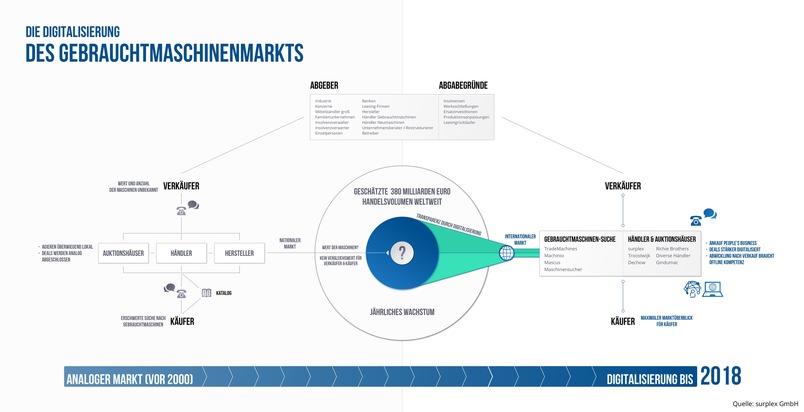 Die Digitalisierung des Gebrauchtmaschinenmarkts wurde in den letzten 20 Jahren in Europa vor allem von mittelständischen Unternehmen vorangetrieben. Dabei war das Online Auktionshaus surplex seit seiner Gründung 1999 maßgeblich in Deutschland und Europa an der digitalen Entwicklung des Marktes beteiligt, insbesondere im Holz- und Metallbereich. Einen weiteren Schub erfuhr der Gebrauchtmaschinenhandel in späteren Jahren durch Start-ups, wie z.B. die Metasuchmaschine TradeMachines oder Online-Anzeigenmärkte wie Machinio.