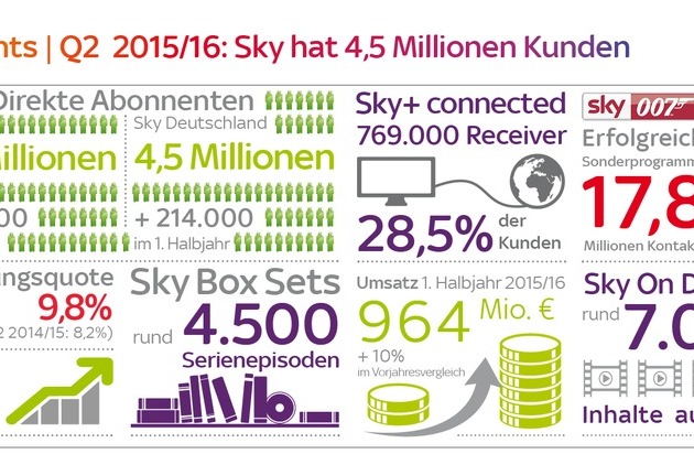 Unterföhring, 29. Januar 2016 - Im 1. Halbjahr des Geschäftsjahres 2015/16 sind Umsatz und Abonnentenzahl von Sky Deutschland erneut deutlich gestiegen. Der Umsatz legte mit 964 Millionen Euro um 10 Prozent gegenüber dem Vorjahr zu. Das Netto-Neukundenwachstum belief sich im 1. Halbjahr auf 214.000. Sky hat damit in Deutschland und Österreich nun rund 4,5 Millionen Kunden und trägt erheblich zum gesamten Kundenwachstum des Mutterkonzerns Sky plc mit derzeit 21,5 Millionen Abonnenten in allen fünf Märkten bei. Eine steigende Nachfrage ist auch bei den Programmen und Produkten von Sky zu verzeichnen: Das Gesamtwachstum aller bezahlten Abonnementprodukte lag im 1. Halbjahr bei 581.000 und beträgt nun 7,7 Millionen. Der durchschnittliche Umsatz pro Privatkunde (ARPU) ist auf 35 Euro gestiegen.