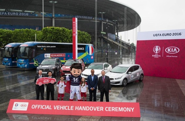 Im Pariser Stade de France wird am 10. Juni das Eröffnungsspiel der UEFA EURO 2016 ausgetragen. Nun wurde vor der Fußballarena im Pariser Vorort Saint-Denis feierlich die Fahrzeugflotte für das Turnier übergeben: Die Kia Motors Corporation, Hauptsponsor und offizieller Automobilpartner der Europameisterschaft, stellt der UEFA insgesamt 447 Fahrzeuge zur Verfügung. Diesen Kia-Fuhrpark wird das EM-Organisationskomitee nutzen, um Fußballer, Schiedsrichter, Offizielle und VIP-Besucher zu chauffieren. Zum Einsatz kommen dabei die SUVs Kia Sorento* und Sportage, die Limousine Kia Optima, der Kompakt-Van Kia Carens, das Crossover-Modell Kia Soul und die Kompaktwagenfamilie Kia cee'd. Der Automobilhersteller wird zudem einen 24-Stunden-Service inklusive Pannendienst für die Flotte einrichten, um deren einwandfreien Betrieb zu gewährleisten.
