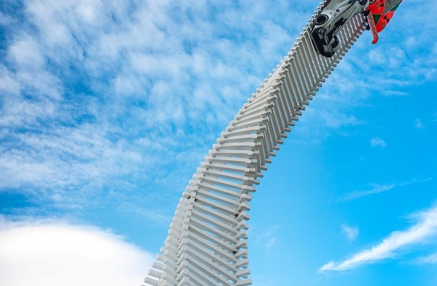 Auf dem diesjährigen Goodwood Festival of Speed (bis 28. Juni) geht es für Mazda aufwärts - im wahrsten Sinne des Wortes: Die 40 Meter hohe Skulptur "Central Feature" auf der Grünfläche vor Goodwood House zeigt diesmal zwei auf einer Stahltreppe gen Himmel fahrende Mazda Rennwagen.