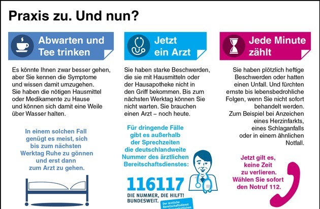 Im Rahmen des heutigen Tages wird zum Thema Bereitschaftsdienst eine Reihe von Medienaktionen sowohl bundesweit als auch regional umgesetzt. Die KBV hat ein Infopaket für Arztpraxen zusammengestellt. Dieses enthält die aktuelle Ausgabe des Patientenmagazins "Zimmer 1" und ein Praxisposter zur bundesweit einheitlichen Bereitschaftsdienstnummer 116117. Gerade letzteres soll den Patienten im Wartezimmer vermitteln, zu welchem Anlass sie die 116117 und wann den Notruf 112 wählen. Mehr Informationen zur Kampagne und zur 116117 finden Sie auf folgenden Seiten: www.ihre-aerzte.de und www.116117info.de.