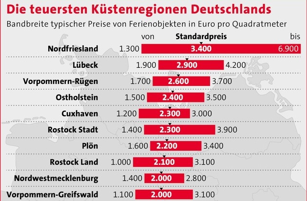 Für die Untersuchung wurden aktuelle Inserate ausgewertet, in denen Ferienhäuser und -wohnungen in den Landkreisen und kreisfreien Städten entlang der deutschen Küsten (ohne Hamburg und Bremen) angeboten werden. Dabei handelt es sich überwiegend um Bestandsimmobilien, aber auch neue Objekte wurden berücksichtigt. Das Ergebnis der Analyse: Die teuerste Küstenregion bildet der Landkreis Nordfriesland mit einem mittleren Preis von 3.400 Euro pro Quadratmeter Wohnfläche, gefolgt von der kreisfreien Stadt Lübeck mit 2.900 Euro und dem Landkreis Vorpommern-Rügen mit 2.600 Euro pro Quadratmeter Ferienimmobilie.