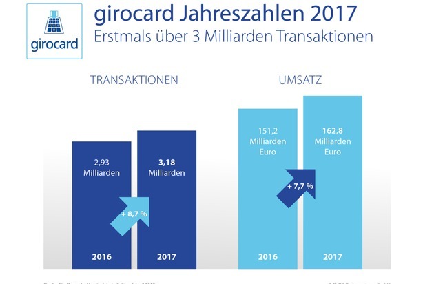 Die girocard knackt 2017 erstmals die Marke von 3 Milliarden Transaktionen. Das gab Dr. Joachim Schmalzl, geschäftsführendes Vorstandsmitglied des Deutschen Sparkassen- und Giroverbands und aktueller Federführer der Deutschen Kreditwirtschaft im Rahmen seines heutigen Vortrags auf dem EHI Kartenkongress 2018 bekannt. Insgesamt zückten die Kunden rund 3,18 Milliarden Mal ihre girocards, um damit insgesamt rund 162,8 Milliarden Euro zu bezahlen. Die Zahl der Transaktionen stieg damit 2017 um rund 8,7 Prozent im Vergleich zum Vorjahr. Bei den Umsätzen gab es im gleichen Zeitraum einen Zuwachs von 7,7 Prozent. Der durchschnittliche Zahlbetrag sank somit um rund 0,9 Prozent von 51,64 Euro auf 51,15 Euro. Dieser Trend bestätigt, dass Kunden auch kleinere Beträge immer häufiger elektronisch bezahlen.