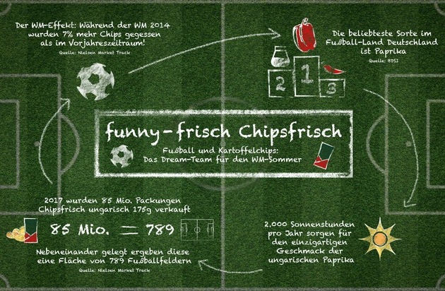 Eine Weltmeisterschaft ohne Kartoffelchips ist kaum vorstellbar. funny-frisch Chipsfrisch, die beliebteste Kartoffelchips-Marke Deutschlands, feiert in diesem Jahr ihr 50-jähriges Jubiläum. Gemeinsam mit den Markenbotschaftern und amtierenden Weltmeistern Bastian Schweinsteiger und Lukas Podolski fiebert funny-frisch der Mission Titelverteidigung entgegen und freut sich auf die nächsten 50 Jahre Chipsfrisch-Genuss.