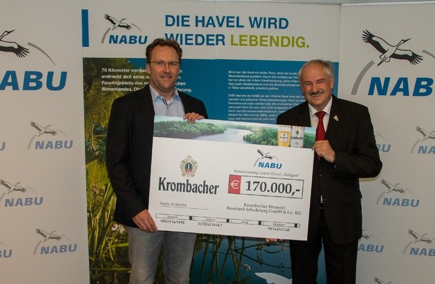 Ein Fluss voller Leben - Die Krombacher Brauerei sorgte mit der Unterstützung des Flussrenaturierungsprojekts, bei dem der Havelaltarm Vehlgaster Dorfhavel wieder an den Hauptstrom der Havel angebunden werden soll, für eine freudige Überraschung beim NABU. Wolfgang Schötz, Leiter Vertriebsmarketing der Krombacher Brauerei, überreichte aktuell einen symbolischen Spendenscheck in Höhe von 170.000 Euro an Olaf Tschimkpe, Präsident des Naturschutzbundes Deutschland e.V.. Bei dem Projekt soll der Altarm "Vehlgaster Dorfhavel" durch den Anschluss an das Hauptfließgewässer zu neuem Leben erweckt werden. Ein weiteres Ziel bei dem Vorhaben ist die Herstellung einer Auenlandschaft und die Verbesserung der Habitationsbedingungen für die Pflanzen- und Tierwelt.