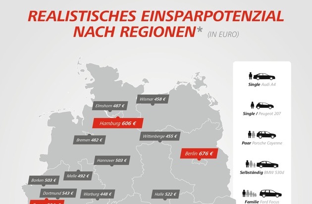 2015 beträgt das realistische Einsparpotenzial bundesweit durchschnittlich 46,8 Prozent; bei allen 300 untersuchten Musterfällen beträgt es im Minimum 38,4 und im Maximum 56,7 Prozent. Es zeigt sich also, dass sich Preisvergleiche für die meisten Autofahrer lohnen könnten.