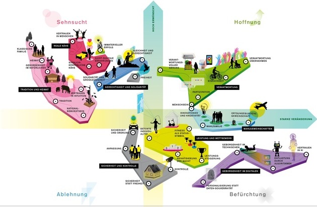 Der wichtigste Hoffnungswert für die Zukunft heißt "Verantwortung", die größte Besorgnis löst die "Geborgenheit im Digitalen" als Ausdruck der alles durchdringenden Digitalisierung aus. Inseln der Sehnsucht sind "Tradition und Heimat", "menschliche Nähe" sowie "Gerechtigkeit und Solidarität", während der Komplex "Sicherheit und Kontrolle" weitgehende Ablehnung erfährt.
