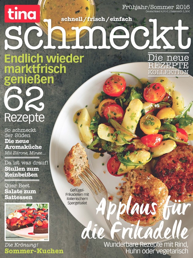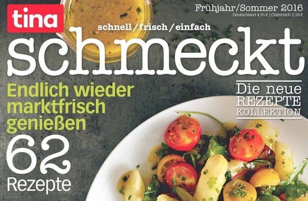 "tina schmeckt ist eine hochwertige Ergänzung zu unserem gewohnten tina Markenkosmos und hebt eine unserer redaktionellen Kernsäulen - Kochen & Backen - in neue Höhen. Die Qualität der Rezepte und Reportagen, aber auch die Haptik und vor allem die Optik unterstreichen die geballte Food-Kompetenz von tina", erklärt Ilka Clark, Verlagsleiterin tina. Das Special, das mit einer Druckauflage von 80.000 Exemplaren zu einem Copy-Preis von 4,95 Euro erscheint, ist ab dem 20. April im Handel erhältlich.