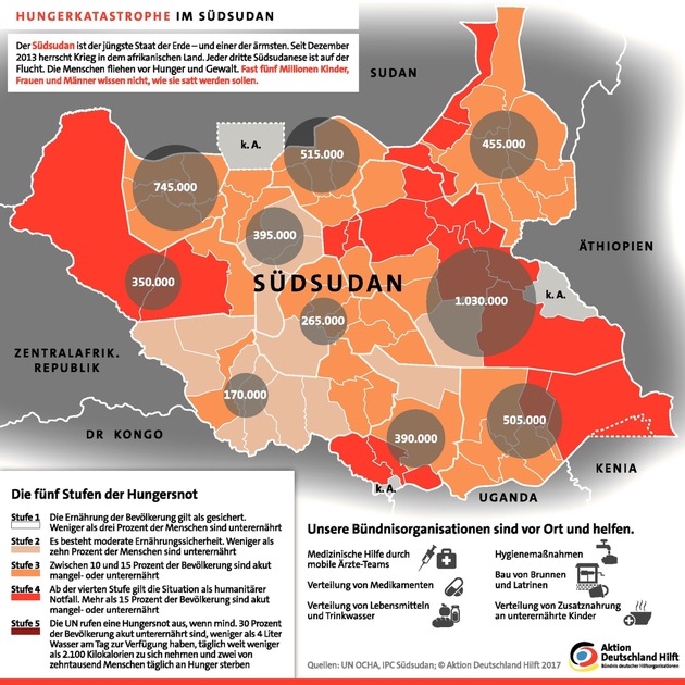 "Vier Jahre Krieg, das bedeutet vier Jahre Leid", sagt Manuela Roßbach, geschäftsführender Vorstand von "Aktion Deutschland Hilft". "Ich war selbst im Südsudan und habe mir ein Bild gemacht. Was ich gesehen habe, hat mich zutiefst erschüttert. Menschen, die um ihr Überleben kämpfen, jeden Tag seit so vielen Jahren." Zahlen können die Not nicht annähernd wiedergeben: Jeder dritte Südsudanese ist auf der Flucht, das sind eine Million Menschen mehr als im vergangenen Jahr. Sie fliehen vor Gewalt, ebenso wie vor anhaltendem Hunger. Fast fünf Millionen Menschen und damit fast jeder Zweite weiß nicht, wie er satt werden soll. In vielen Bundesstaaten gilt die zweithöchste Hungerkategorie.