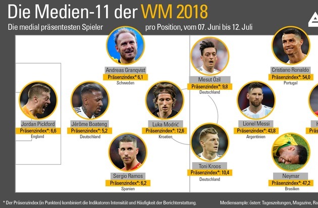 Knapp dahinter belegen der brasilianische Ballkünstler Neymar (47,2 Punkte) und der argentinische Wirbelwind Lionel Messi (43,8 Punkte) die Plätze zwei und drei. "Einzeln verbucht jeder dieser drei Spieler mehr Aufmerksamkeit als das gesamte Mittelfeld der aktuellen ?Medien-11?", fasst Manuel Kerzner, Medienanalyst von APA-DeFacto, das Ergebnis der drei Superstars zusammen. Als Draufgabe steht mit dem Engländer - und möglichen Torschützenkönig - Harry Kane (22,6 Punkte) noch ein vierter Stürmer in der Mannschaftsaufstellung.