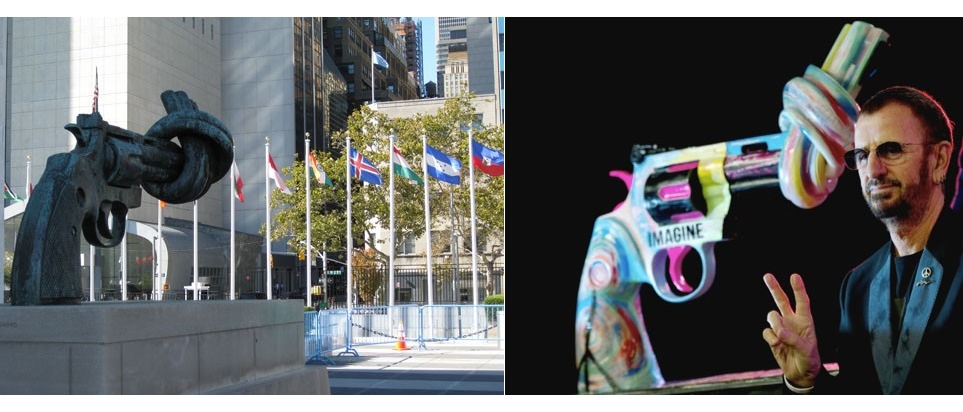 "Imagine"; der Song, der John Lennon in der Musikwelt und für seine Fans unsterblich machte. Obwohl Lennon selbst, am 8. Dezember 1980, Opfer eines Attentats wurde. Ihm zu Gedenken schuf sein Freund, der schwedische Künstler Carl Frederik Reuterswärd, die berühmte "Knotted Gun"-Skulptur, den Revolver mit dem verknoteten Lauf, der als weltweites Symbol gegen Gewalt vor der Zentrale der Vereinten Nationen steht. 30 Replikate stehen an weltweit strategischen Plätzen (In Deutschland beim Kanzleramt in Berlin).