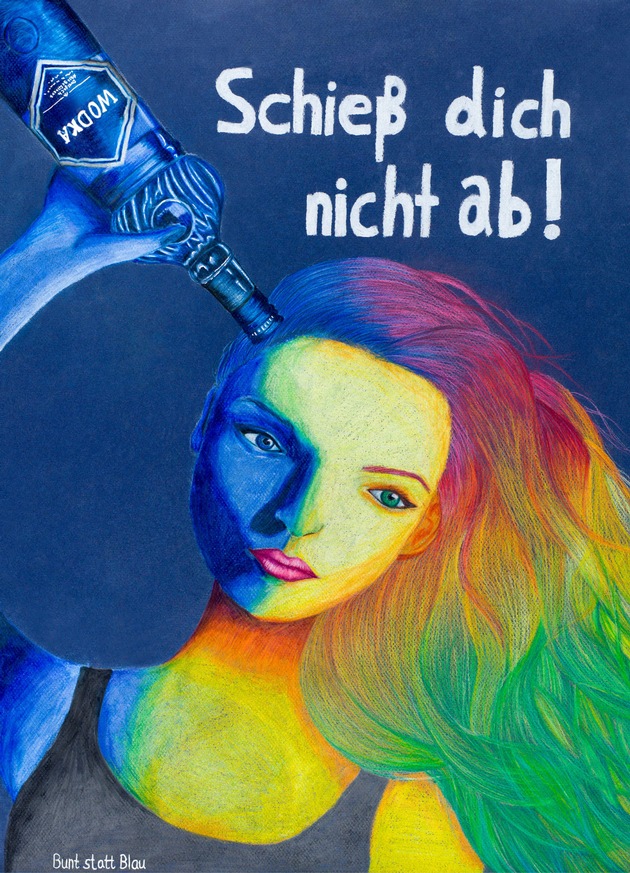 Das Kunstwerk der Bundessiegerin Hannah Hauswald aus Lüneburg in Niedersachsen zeigt einen bunten Mädchenkopf mit blauer Wodkaflasche. Dazu der Spruch: "Schieß Dich nicht ab!" "Die Flasche steht symbolisch für eine Pistole, welche sich das Mädchen an die Schläfe setzt, als ob sie einen Selbstmord begehen würde", erklärt die 14-Jährige ihr erfolgreiches Plakat. "Mein Plakat zeigt, wie der Alkoholkonsum Lebensfreude und Hoffnung verdrängen kann."