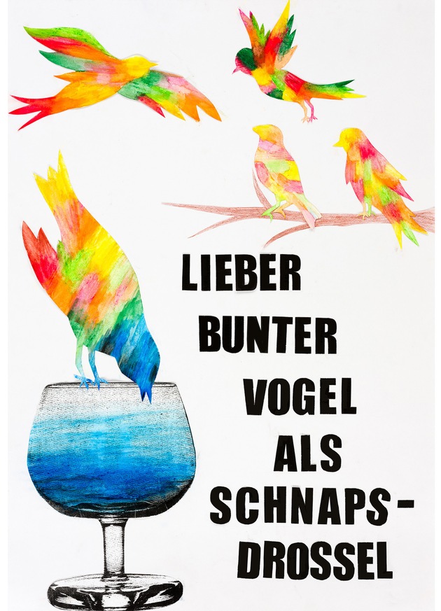 "Lieber bunter Vogel als Schnapsdrossel", steht in großen schwarzen Buchstaben auf dem Siegerbild. Bunte Vögel fliegen über einem einsamen blauen Artgenossen, der auf einem Weinglas sitzt und trinkt. "Gemeinsam bunt ist besser als einsam blau", erklären die Siegerinnen ihr erfolgreiches Plakat.