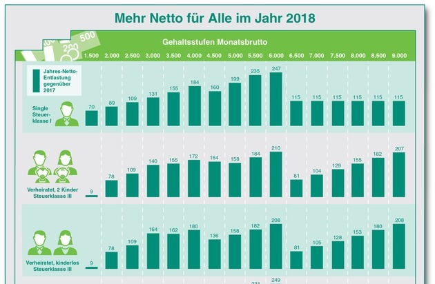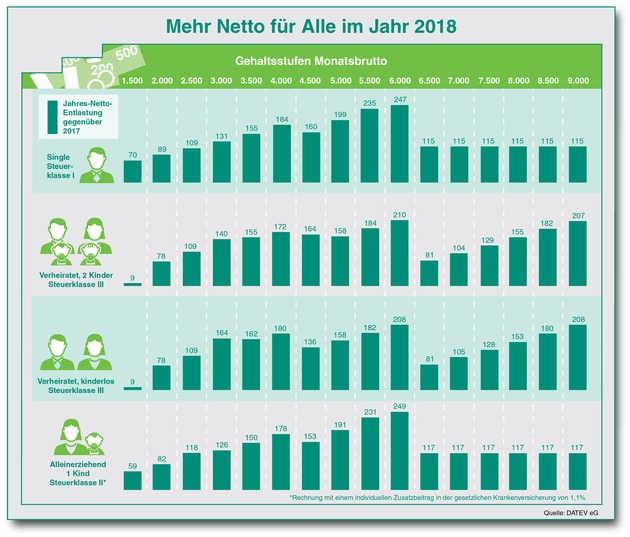 Eine Übersicht, wie sich die Neuregelungen auf dem Konto bemerkbar machen, hat die DATEV eG für verschiedene Gehaltsstufen in den Konstellationen Single (Steuerklasse I), verheiratet (Steuerklasse III), verheiratet mit zwei Kindern (Steuerklasse III) und alleinerziehend mit einem Kind (Steuerklasse II) berechnet. Am meisten profitieren über alle Steuerklassen hinweg Beschäftigte mit einem monatlichen Brutto-Gehalt von 6.000 Euro. Das größte Plus verbuchen Alleinerziehende und Alleinstehende in dieser Gehaltsstufe. Sie können sich über eine Entlastung von 249 bzw. 247 Euro im Jahr freuen. Den geringsten Zuwachs im Geldbeutel verzeichnen Verheiratete mit einem Einkommen von 1.500 Euro. Bei Ihnen beläuft sich die Steuerersparnis 2018 auf lediglich 9 Euro im Jahr.