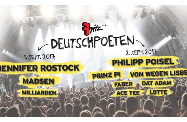 Schon seit 2010 präsentiert Fritz, das junge Radio vom rbb, mit dem Format "Fritz DeutschPoeten" etablierte Künstler und junge Talente der deutschsprachigen Musikszene. So fördert Fritz kontinuierlich und nachhaltig die deutsche Musikkultur - jenseits kommerzieller Interessen. In den Vorjahren traten bei den Fritz DeutschPoeten Cro, Jan Delay, Fettes Brot, Sido, AnnenMayKantereit, Philipp Poisel, Marteria, Kraftklub, Bilderbuch, Wir sind Helden, Tim Bendzko, Bosse, MIA., Madsen, Max Herre, Thees Uhlmann, Andreas Bourani, Wanda und viele weitere Stars auf und begeisterten bis zu 13.000 Fans.