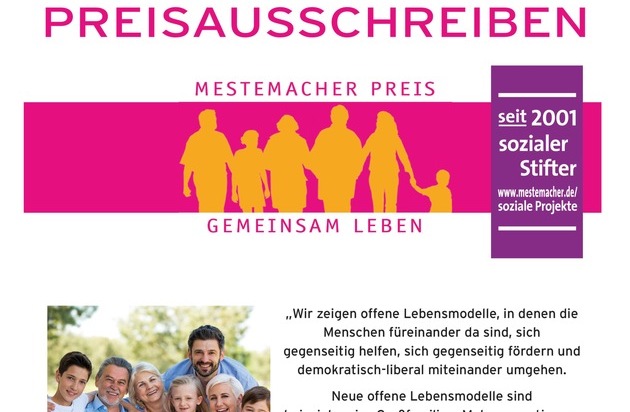 Der neue Sozialpreis der 1871 gegründeten Großbäckerei Mestemacher trägt den Titel "GEMEINSAM LEBEN". Worum geht es? Der Öffentlichkeit sollen offene Lebensmodelle, in denen die Menschen füreinander da sind, sich gegenseitig helfen, sich gegenseitig fördern und demokratisch-liberal miteinander umgehen, gezeigt werden. Neue offene Lebensmodelle sind beispielsweise Großfamilien oder Mehrgenerationenhäuser. Zu gewinnen sind 4 mal 2.500 Euro Preisgeld. Es werden also vier Gewinnerinnen und/oder Gewinner ausgezeichnet. Die Bewerbungsfrist läuft bis zum 30. September 2017.