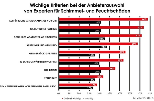 Die Deutschen haben ganz konkrete Vorstellungen, was sie von einem guten Handwerksbetrieb erwarten. Dies geht aus einer repräsentativen Befragung des Meinungsforschungsinstituts "Heute und Morgen" hervor, die im Auftrag des Sanierungsunternehmens ISOTEC durchgeführt wurde. Sehr wichtig ist 44% der Befragten eine konkrete Schadenanalyse vor Ort sowie eine ausführliche Beratung - und eben keine Ferndiagnose oder allgemeine Standardaussagen. Da die Angst vor hohen Kosten für die professionelle Sanierung bei den Betroffenen immer mitschwingt, möchten 42% unbedingt einen garantierten Festpreis erhalten, der auch der tatsächliche Endpreis ist, bevor sie sich für einen Anbieter entscheiden.