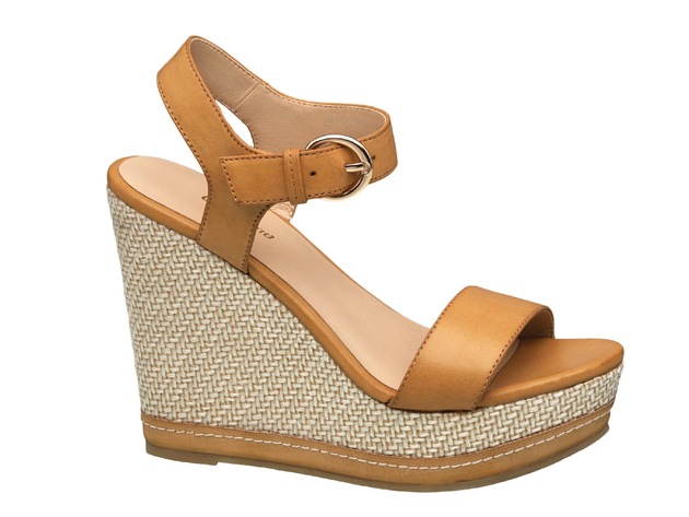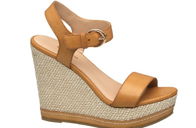 Die Keilsandale ist der richtige Begleiter für den Sommer. Sie wirkt puristisch und modisch zugleich. Die Kombination verschiedener Materialien, wie cognacfarbenes Kunstleder und die Weboptik des Keilabsatzes, prägt ihren Stil und lässt vielfältige Outfit-Kombinationen zu. Mit lässigen Shorts kommt sie deshalb eher sportlich daher, zu Sommerkleidern verspielt und weiblich. Durch den Keilabsatz ist die Sandalette besonders bequem, streckt das Bein der Trägerin und lässt so den Gang eleganter wirken. Das Model ist aktuell für 24,90 Euro in den Deichmann-Filialen und unter www.deichmann.com im Onlineshop erhältlich.