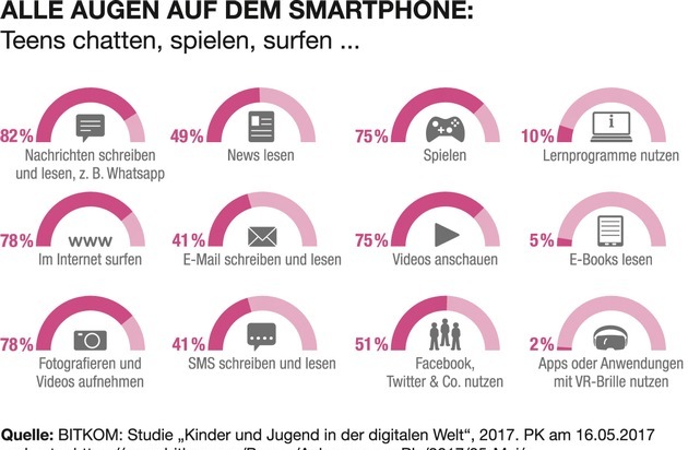 Zwei Stunden fernsehen, zwei Stunden gamen, in der Schule mit PC und Tablet arbeiten, für die Hausaufgaben im Internet surfen - und den Rest des Tages bloß nicht das Smartphone aus den Augen lassen: Kinder und Jugendliche erlauben ihrem Blick immer weniger, draußen bei Tageslicht für längere Zeit in die Ferne zu schweifen. Sie starren im Nahsichtmodus auf Bildschirm und Display - und das quasi ohne mit der Wimper zu zucken. Denn wer sich auf einen Punkt konzentriert, blinzelt nur ein- bis zweimal pro Minute statt mindestens zehnmal so oft. Die Folge sind trockene Augen - eine Einladung für Krankheitserreger. Auch blaues Licht, das von Displays ausgeht, kann zu Entzündungen von Binde- und Hornhaut sowie zu Schädigungen von Augenlinse und Netzhaut führen.2