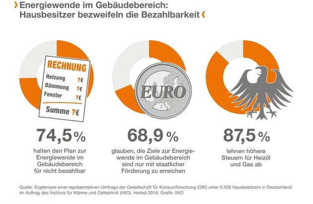 In Auftrag gegeben wurde die GfK-Befragung unter rund 3.500 Besitzern von Ein- und Zweifamilienhäusern vom Institut für Wärme und Oeltechnik (IWO). Dessen Geschäftsführer Adrian Willig weist darauf hin, dass die Kosten der Energiewende im Gebäudebereich bislang von der Politik vernachlässigt werden: "Ein relevanter Beitrag des Gebäudesektors für den Klimaschutz ist aber nur dann realistisch, wenn die dafür notwendigen Maßnahmen auch für die Menschen bezahlbar sind. Deswegen ist ein technologieoffener Wettbewerb um die besten und günstigsten Lösungen unverzichtbar."