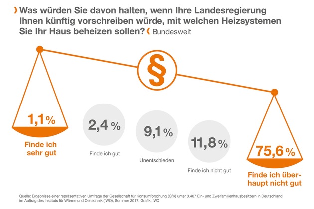 "Durch diesen Dreiklang werden flüssige Brenn- und Kraftstoffe einen Beitrag zur Erreichung der Klimaziele leisten - bis 2050 und darüber hinaus", so Willig. Voraussetzung für die Umsetzung dieses Drei-Punkte-Planes sind nach Auffassung des IWO die Prinzipien der Technologieoffenheit und Freiwilligkeit. Das bestätigt auch eine aktuelle bundesweite, repräsentative Umfrage der GfK im Auftrag des IWO. Demnach wollen mehr als 87 Prozent der Ein- und Zweifamilienhausbesitzer über ihr Heizsystem frei entscheiden und lehnen staatliche Vorgaben bei der Heizungswahl ab. "Information und finanzielle Förderung bringen mehr als Vorschriften", so Willig.