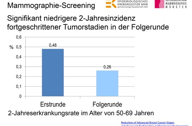 Bei der Auswertung von rund 19.500 Erstteilnehmerinnen und 18.000 wiederholt teilnehmenden Frauen in Nordrhein-Westfalen zeigen sich deutliche Vorteile für die zweite Gruppe. Von 1.000 Frauen, die erstmals eine Mammographie-Screening-Untersuchung durchgeführt haben, wurde innerhalb von zwei Jahren bei etwa 13 Frauen Brustkrebs entdeckt. Dabei sind auch die Frauen erfasst, die erst nach der Screening-Untersuchung in den darauf folgenden zwei Jahren (im Intervall) erkrankt sind. Bei rund 5 Frauen war der Krebs in einem fortgeschrittenen Stadium.