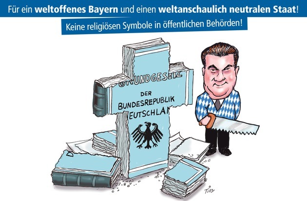 Pünktlich zum Inkrafttreten der neuen Kreuz-Verordnung in Bayern am Freitag, dem 1. Juni 2018, veranstalten die Giordano-Bruno-Stiftung (gbs) und der Bund für Geistesfreiheit (bfg) einen "Aktionstag für ein weltoffenes Bayern und einen weltanschaulich neutralen Staat". Der Düsseldorfer Künstler Jacques Tilly hat hierzu eine Karikatur von Markus Söder gezeichnet, der mit einer Säge das deutsche Grundgesetzbuch auf Kreuzform zurückgeschnitten hat. Am Wochenende wird das Söder-Plakat in München vielerorts zu sehen sein.