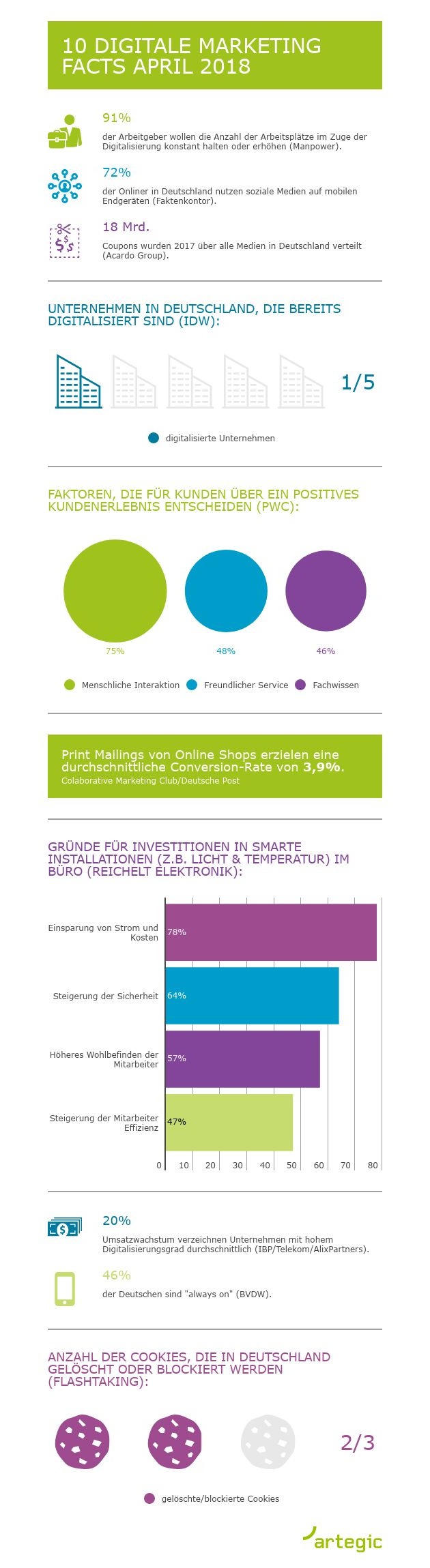 Wir informieren Sie jeden Monat über die wichtigsten Fakten und Studien aus der digitalen Wirtschaft. 10 digitale Marketing KPI April 2018 finden Sie hier in einer übersichtlichen Infografik.
