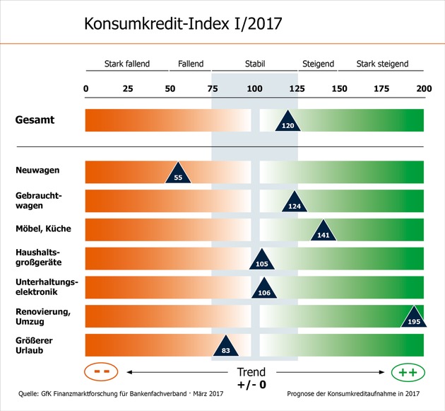 Im laufenden Jahr planen Verbraucher nur geringfügig mehr Kredite für privaten Konsum aufzunehmen als im Vorjahr. Dies prognostiziert der Konsumkredit-Index des Bankenfachverbandes, für den die GfK regelmäßig 1.700 Haushalte nach ihren Anschaffungs- und Finanzierungsabsichten befragt. Anfang 2016 hatten die Verbraucher noch angegeben, die Aufnahme von Konsumkrediten auszuweiten (129 Punkte). In 2017 ist mit 120 Punkten mit einer stabilen Kreditaufnahme mit leicht positiver Tendenz zu rechnen. "Das Verbrauchervertrauen ist nach wie vor hoch und die Rückzahlungsmoral gut", sagt Peter Wacket, Geschäftsführer des Bankenfachverbandes.