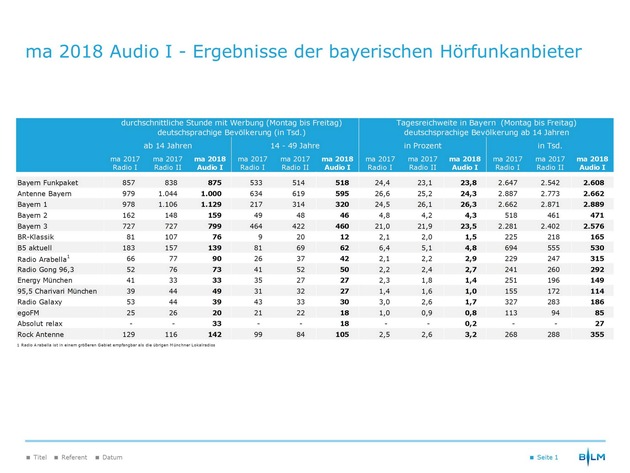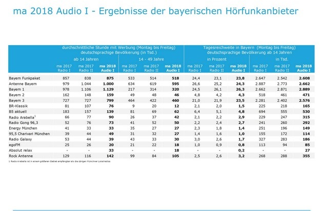 Die im Bayern Funkpaket zusammengeschlossenen bayerischen Lokalradios erzielen nach den Ergebnissen der Media Analyse 2018 Audio I eine durchschnittliche Reichweite von 875.000 Hörern pro Stunde. Im Vergleich zur Media Analyse 2017 Radio II gewinnen die Bayerischen Lokalradios damit 37.000 Hörer hinzu.