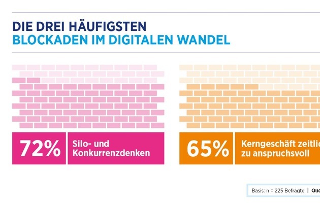 Um die Digitalisierung umzusetzen, müssen viele deutsche Unternehmen noch hohe Hürden überwinden. Vor allem das Insel- und Konkurrenzdenken der Fachabteilungen (72 %) stellt die größte Barriere auf dem Weg in die digitale Organisation dar. Zudem sind die Freiräume für die mit der Digitalisierung verknüpften Change-Maßnahmen begrenzt: Das Kerngeschäft nimmt zu viel Zeit in Anspruch (65 %). Im dynamischen Tagesgeschäft mit seinem hohen Kosten- und Beschleunigungsdruck (67 bzw. 64 %) wird die anstehende digitale Transformation zerrieben.