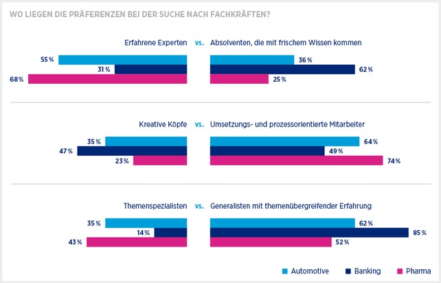 Je nach Branche zeigt sich ein unterschiedliches Bild. In der Automobilindustrie sind bei der Digitalisierung erfahrene Experten (55 %) statt Hochschulabsolventen (36 %) gefragt und deutlich mehr Generalisten (62 %) als Themenspezialisten (35 %). Zudem suchen Automobilunternehmen nicht die kreativen Köpfe (35 %), sondern umsetzungsorientierte Mitarbeiter (63 %).