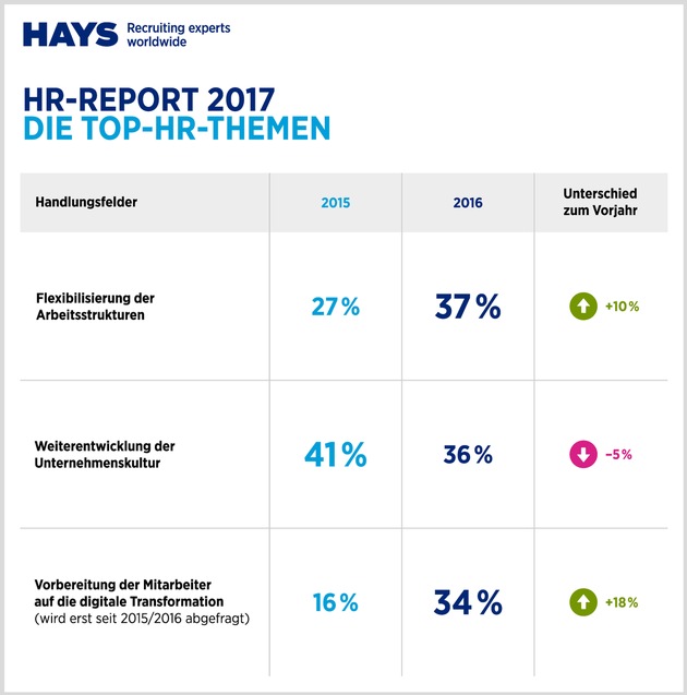 Die Digitalisierung sorgt dafür, dass sich die HR-Prioritäten in Unternehmen verschieben. So hat sich die Rangfolge der wichtigsten HR-Handlungsfelder im Vergleich zum Vorjahr deutlich verändert: Im neuen HR-Report 2017 steht die Flexibilisierung der Arbeitsstrukturen auf dem ersten Platz (von 27 auf 37 Prozent).