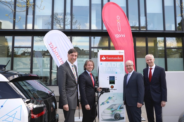 Im Beisein von Oberbürgermeister Hans Wilhelm Reiners enthüllte Ulrich Leuschner, Vorstandsvorsitzender der Santander Consumer Bank AG, die innovative Schnellladesäule feierlich und betonte: "Der Grundsatz der Nachhaltigkeit ist Teil unserer Unternehmenspolitik. Deshalb liegt uns die Förderung der Elektromobilität am Herzen und wir unterstützen nun auch aktiv den Ausbau der Ladeinfrastruktur in Deutschland." Thomas Hanswillemenke, Vorstand Mobilität bei Santander, ergänzt: "Schon seit einiger Zeit bieten wir unseren Kunden über das eFinance-Programm Unterstützung bei der Finanzierung von Elektrofahrzeugen an. Diese Technologie wird mit fortschreitenden Innovationen einen immer höheren Stellenwert im Kfz-Markt einnehmen."