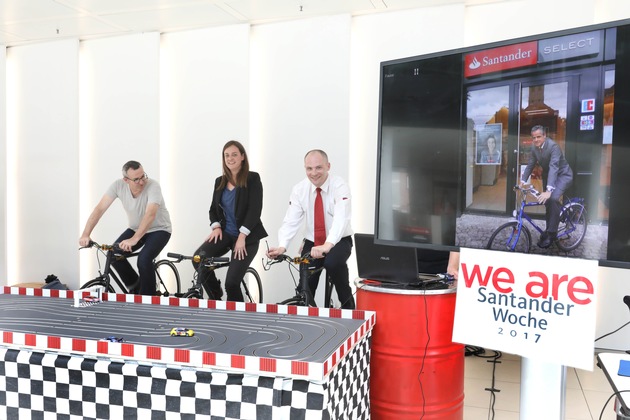 Und heute Fahrrad-Challenge und damit wieder eine sportliche Herausforderung innerhalb der Santander-Woche. Zahlreiche Mitarbeiter lieferten sich in der Unternehmenszentrale, im Gebäude am Nordpark sowie in den Filialen ein sportliches Duell. Sie traten kräftig in die Pedalen, denn für jeden gefahrenen Kilometer spendet die Bank zwei Euro für einen guten Zweck.