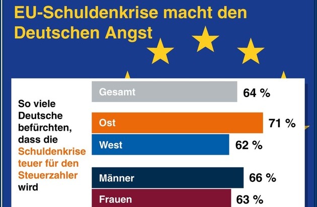 Das durchschnittliche Angstniveau in Ost und West ist gegenüber dem Vorjahr unverändert. Während im Osten 43 Prozent der Bevölkerung sorgenvoll in die Zukunft blicken, sind es im Westen nur 38 Prozent. Der größte Unterschied: Die Furcht vor steigenden Lebenshaltungskosten ist im Osten um 19 Prozentpunkte höher als im Westen und liegt dort mit 63 Prozent weiterhin an der Spitze der 16 langjährig abgefragten Standardängste. Noch größer ist nur die Furcht, dass die deutschen Steuerzahler die Kosten der EU-Schuldenkrise schultern müssen (Ost: 71 Prozent, West: 62 Prozent). Ebenfalls im Osten deutlich höher sind die Ängste vor einem Krieg mit deutscher Beteiligung (Ost: 47 Prozent, West: 39 Prozent) und vor dem Verlust des eigenen Arbeitsplatzes (Ost: 39 Prozent, West: 30 Prozent).
