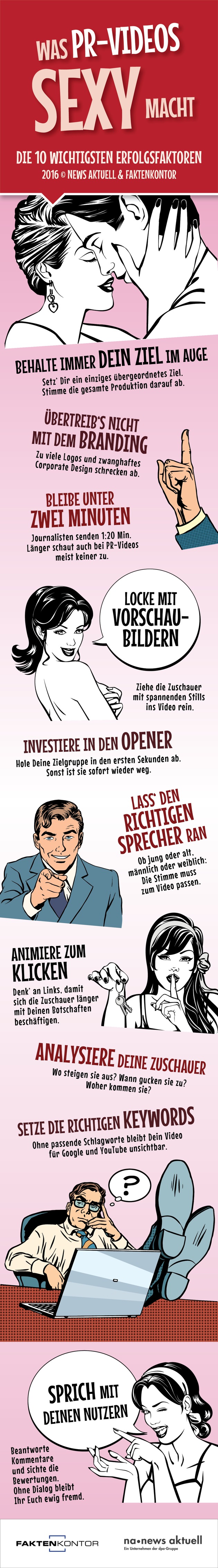 Die zehn wichtigsten Erfolgsfaktoren im Detail: 1. Behalte immer Dein Ziel im Auge Setz´ Dir ein einziges übergeordnetes Ziel. Stimme die gesamte Produktion darauf ab. 2. Übertreib´s nicht mit dem Branding Zu viele Logos und zwanghaftes Corporate Design schrecken ab. 3. Bleibe unter zwei Minuten Journalisten senden 1:20 Min. Länger schaut auch bei PR-Videos keiner zu. 4. Locke mit Vorschau-Bildern Ziehe die Zuschauer mit spannenden Stills ins Video rein. 5. Investiere in den Opener Hole Deine Zielgruppe in den ersten Sekunden ab. Sonst ist sie sofort wieder weg. 6. Lass den richtigen Sprecher ran. Ob jung oder alt, männlich oder weiblich: Die Stimme muss zum Video passen. 7. Animiere zum Klicken Denk´ an Links, damit sich die Zuschauer länger mit Deinen Botschaften beschäftigen. 8. Analysiere Deine Zuschauer Wo steigen sie aus? Wann gucken sie zu? Woher kommen sie? 9. Setze die richtigen Keywords Ohne passende Schlagworte bleibt Dein Video für Google und YouTube unsichtbar. 10. Sprich mit Deinen Nutzern Beantworte Kommentare und sichte die Bewertungen. Ohne Dialog bleibt Ihr Euch ewig fremd.
