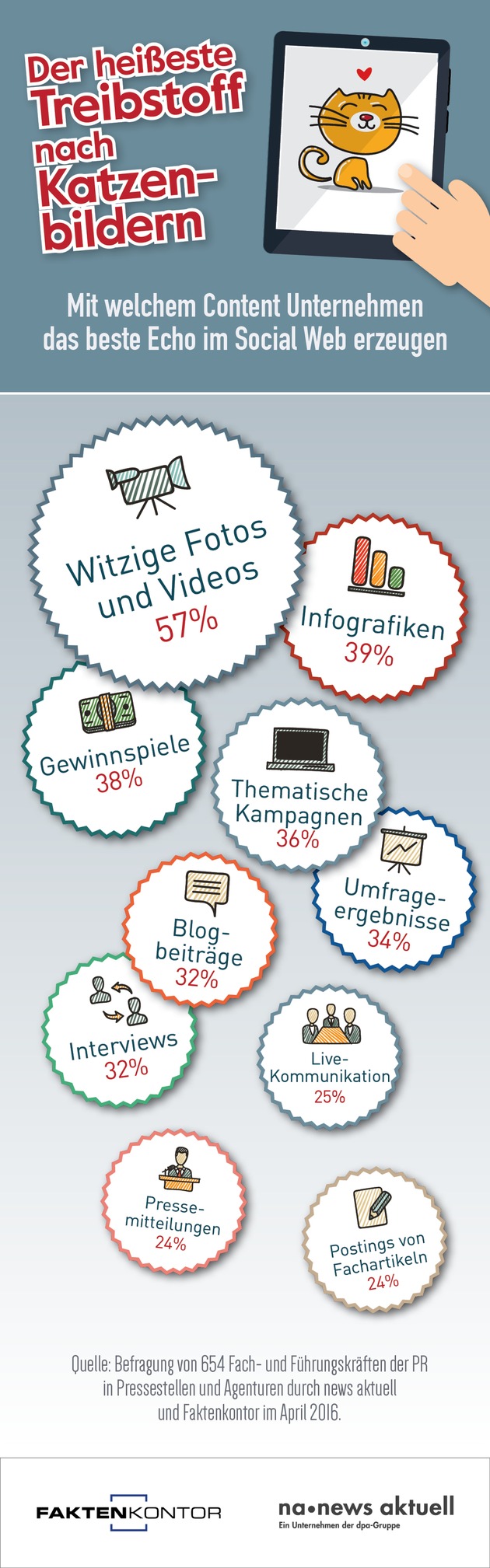 1. Witzige Fotos und Videos (57 Prozent) 2. Infografiken (39 Prozent) 3. Gewinnspiele (38 Prozent) 4. Thematische Kampagnen (36 Prozent) 5. Umfrageergebnisse (34 Prozent) 6. Blogbeiträge (32 Prozent) 7. Interviews (32 Prozent) 8. Live-Kommunikation (25 Prozent) 9. Pressemitteilungen (24 Prozent) 10. Fachartikel (24 Prozent)