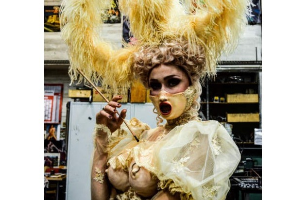 PUCHTA: Auf dem einen Foto sehen wir Théa Hart Barnwell im Kostüm von Jean Paul Gaultier. Sie ist Mitglied unseres internationalen Ballettensemble. 'Gaultiers Beauty' lautet der Titel des Bildes. Geshootet wurde es von Franziska Köhler. Das zweite zeigt Azama Bashir als 'Leder Lady', wie sie den riesigen, 24 Meter langen Lastenaufzug zum Leben erweckt, mit dem früher Bühnenbilder und Plakate transportiert wurden. Festgehalten wurde dieser Moment von Influencer Tommy Halfter. Beim dritten Bild heißt es dann 'Wat muss, dat muss'. Auch die Show-Band des Palastes, eine der größten weltweit im Ensuite-Bereich, braucht mal eine Probenpause und chillt zwischen zwei Vorstellungen - gemeinsam mit Fotograf Dennis Weinbörner.