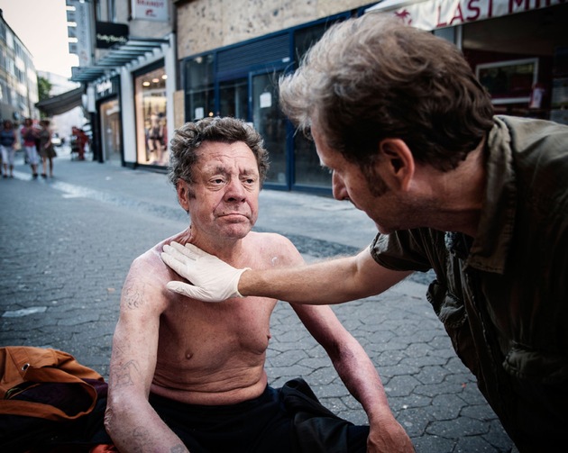 TRABERT: Das Bild zeigt eine intime zwischenmenschliche Situation zwischen Patient und Arzt im öffentlichen Raum. Um ein solches Foto authentisch machen zu können, braucht der Patient und auch der Arzt Vertrauen in den Fotografen. Gerade um nicht voyeuristisch sondern authentisch die Situation abbilden zu können. Da unser Fotograf Andreas Reeg durch die jahrelange, kontinuierliche Begleitung selbst einen persönlichen Bezug zu vielen von Wohnungslosigkeit betroffenen Menschen und auch zu mir als behandelnden Arzt aufgebaut hatte, war dieses intime, authentische Bild möglich.