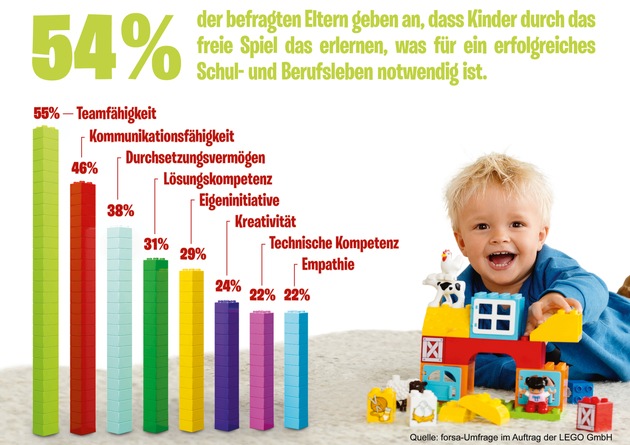 Mehr als die Hälfte der Eltern (54 %) sind der Meinung, dass Kinder durch das freie Spiel alles Notwendige für ein erfolgreiches Schul- und Berufsleben lernen. Das ist das Ergebnis einer aktuellen und repräsentativen Umfrage des Meinungsforschungsinstituts forsa im Auftrag der LEGO GmbH. Befragt wurden Mütter und Väter, die ein oder mehrere Kinder im Alter zwischen einem und fünf Jahren haben. Kommunikations- und Teamfähigkeit sowie Problemlösungskompetenz - drei Schlüsselkompetenzen der sogenannten "21st Century Skills" - sind laut Eltern für ihr Kind besonders wichtig, um den sich kontinuierlich wandelnden Anforderungen in der Zukunft gewachsen zu sein.