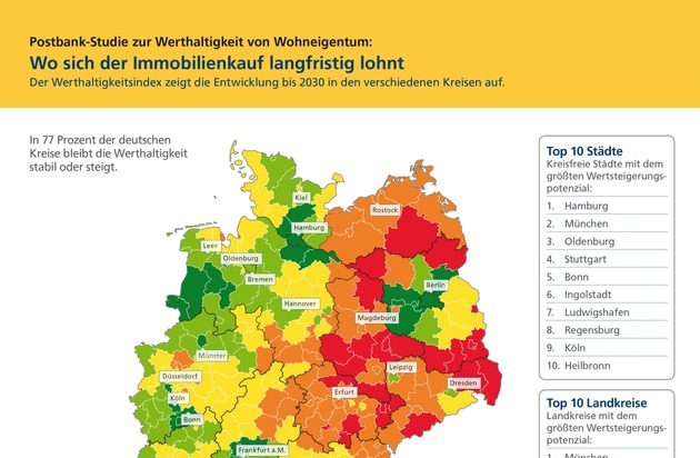 Das Wirtschaftsforschungsinstitut Prognos hat für die Postbank die künftige Wertentwicklung von Privatimmobilien in den 402 deutschen Kreisen prognostiziert und in einem "Werthaltigkeits-Index Prognose 2030" abgebildet. Der Index basiert auf makro- und sozioökonomischen Indikatoren zur Bevölkerungsentwicklung, Altersstruktur, Haushaltsentwicklung, Bruttowertschöpfung und Wohnflächennachfrage in den jeweiligen Regionen.