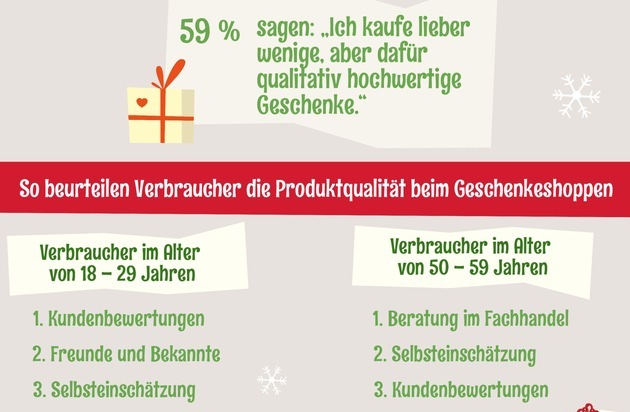 Während die Abfolge der Auswahlkriterien von Geschenken bei Männern und Frauen identisch ist, unterscheiden sich einige Kriterien dennoch in ihrer Ausprägung. So legen Frauen deutlich mehr Wert auf den persönlichen Bezug eines Geschenkes (72 versus 57 Prozent). Männer hingegen achten eher auf die Funktionalität (29 versus 23 Prozent) sowie den Wert und die Bekanntheit einer Marken (7 versus 3 Prozent). Test- und Gütesiegel nicht ausschlaggebend für Qualitätsbewertung Bei der Qualitätsbewertung ihrer Weihnachtsgeschenke orientieren sich Verbraucher allgemein am häufigsten an Kundenbewertungen (32 Prozent). Besonders unter den 18- bis 29-Jährigen ist diese Informationsquelle beliebt (44 Prozent) - gefolgt von den Empfehlungen von Freunden und Bekannten (30 Prozent) und einer eigenen Qualitätsbeurteilung (26 Prozent). Bei den 50- bis 59-Jährigen hingegen steht die Beratung im Fachhandel an erster Stelle (37 Prozent) - gefolgt von der Bildung eines eigenen Urteils (33 Prozent) sowie Kundenbewertungen (25 Prozent). Der Bekanntenkreis spielt in dieser Altersgruppe lediglich eine untergeordnete Rolle (12 Prozent).