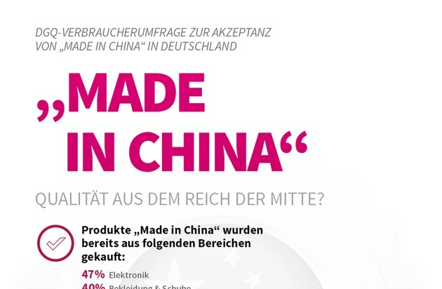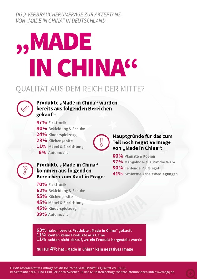 Für die repräsentative Verbraucherstudie hat die Deutsche Gesellschaft für Qualität e.V. (DGQ) gemeinsam mit dem Marktforschungsinstitut Innofact AG rund 1.010 Personen zwischen 18 und 69 Jahren zu den Produktkennzeichnungen "Made in China" und "Made in Germany" befragt. Die unabhängige Online-Erhebung fand im September 2017 statt.