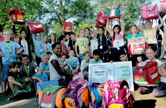 Bevor sie in diesem Jahr an die Düsseldorfer Flüchtlinge verteilt werden, bestückte die Provinzial Rheinland die Ranzen noch mit neuen Schreibutensilien. Insgesamt wurden 70 Tornister mit Buntstiften, Schreibheften, Filzern und Pinseln befüllt. Vertreter des Sachspendenlagers auf dem Vogelsanger Weg holten die Tonis ab, um sie dann in den Sommerferien an Düsseldorfer Flüchtlingskinder zu verteilen.