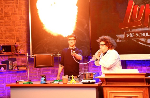 Mit Salami schweißen? Mehl explodieren lassen? Auf einem Maisstaerke-Wasser-Gemisch laufen? Fuer den richtigen Knalleffekt in Luke Mockridges neuer SAT.1-Show "LUKE! Die Schule und ich - VIPs gegen Kids" ab Freitag, 5. Mai, 20:15 Uhr, sorgt Konrad Stoeckel als "verrueckter Professor" mit seinen spektakulaeren Labor-Versuchen. "Wer sich Konrad einlaedt, der muss produktionsversicherungs-technisch eine Schippe drauflegen. Der hat es echt krachen lassen", kuendigt Luke Mockridge an. "Er hat zwar immer alles doppelt und dreifach abgesichert, aber zum Beispiel hat es ihm seinen Fingernagel bei einer Explosion abgesprengt. Den hat er sich hinter der Buehne einfach wieder mit Sekundenkleber angeklebt. Dann hat er noch eine Gluehbirne gegessen. Konrad ist schon ein harter Hund und ein verrueckter Typ - ein Gewinn fuer jede Sendung."