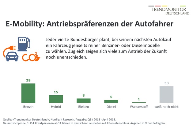 Dies zeigt die aktuelle Ausgabe des «Trendmonitor Deutschland» des Marktforschungsinstituts Nordlight Research zum Schwerpunktthema "E-Mobility". Über 1.000 Verbraucher mit Zugang zum Internet wurden im März 2018 repräsentativ zu aktuellen Trendprodukten und Trendtechnologien befragt.