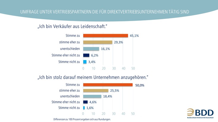 Demnach beschreiben sich Dreiviertel der befragten Verkaufsberater als Verkäufer aus Leidenschaft und stimmen der Aussage zu, stolz darauf zu sein, ihrem Unternehmen anzugehören. "Direktvertriebsunternehmen fördern mit Schulungen und Team-Aktionen das Gefühl der Zusammengehörigkeit und das Verkaufstalent ihrer Partner. Nur wer seine Tätigkeit mit Leidenschaft ausübt, kann erfolgreich sein", erklärt Jochen Acker, Vorstandsvorsitzender des BDD.