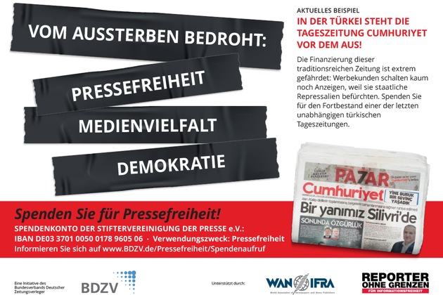 Als ein Signal der Solidarität zum 3. Mai für Pressefreiheit, Medienvielfalt und Demokratie schaltet der BDZV mit Unterstützung von WAN-IFRA (Weltverband der Zeitungen und Nachrichtenmedien) und Reporter ohne Grenzen deshalb den gesamten Mai hindurch Spendenanzeigen in den deutschen Zeitungen.